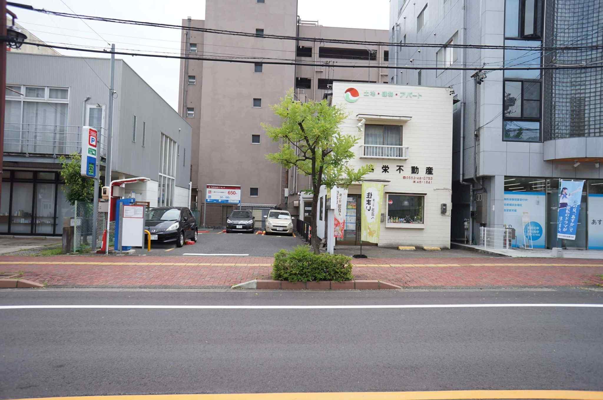 健栄不動産さんの青と黄色の看板が目印です。